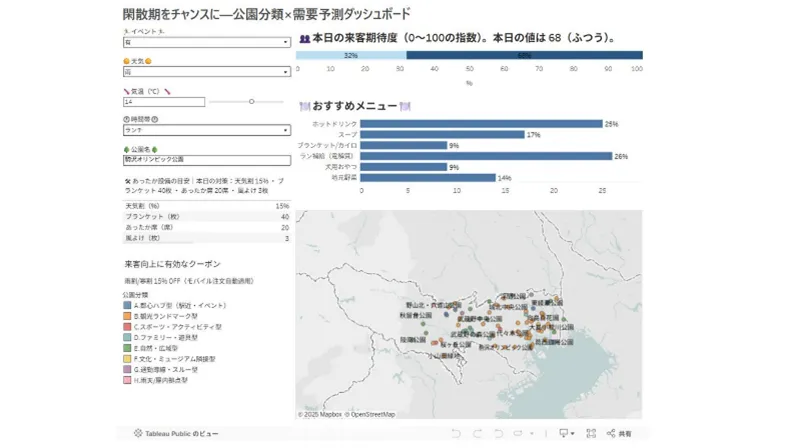 都立公園・庭園の「公共施設一覧」を起点に、公園を8類型へ分類し、気象・イベント・暦を加味した前日来客期待度を可視化しました。