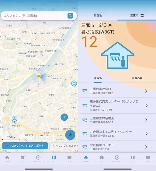 熱中症対策施設の場所をマップに表示し、経路案内する機能に加えて、熱中症について気軽に学べるコンテンツや過去にどのスポットなどに訪れたかを記録できるチェックイン機能があります。